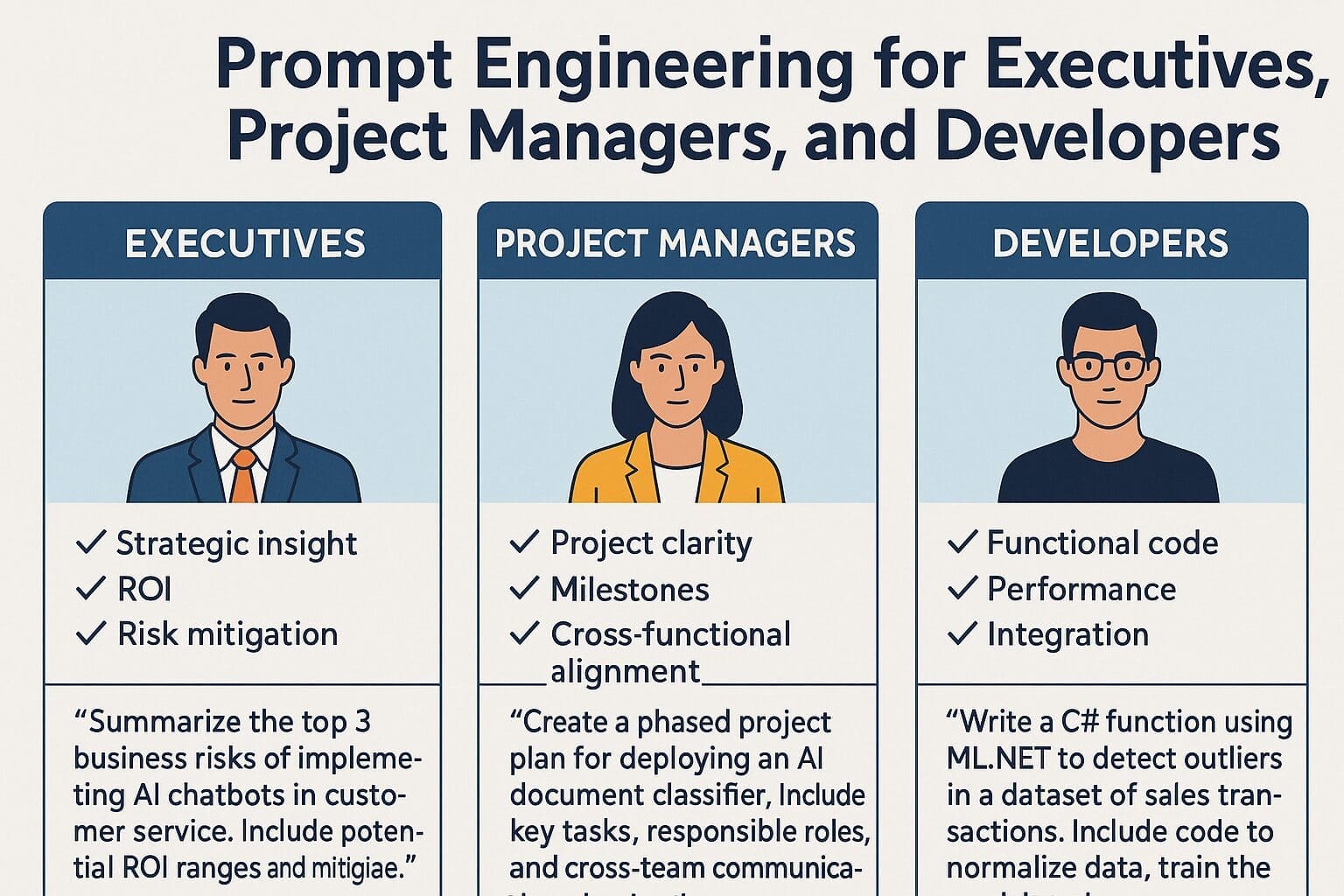 Let’s explore how to optimize AI prompts for three essential enterprise roles: executives, project managers, and developers.