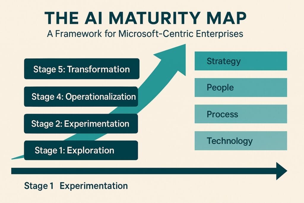 For Microsoft-centric enterprises, the journey from Stage 1 (Exploration) to Stage 5 (Transformation) involves discipline, governance, and alignment across people, process, and technology. By applying this framework, executives ensure that AI adoption is not a scattershot of pilots but a deliberate march toward strategic impact.