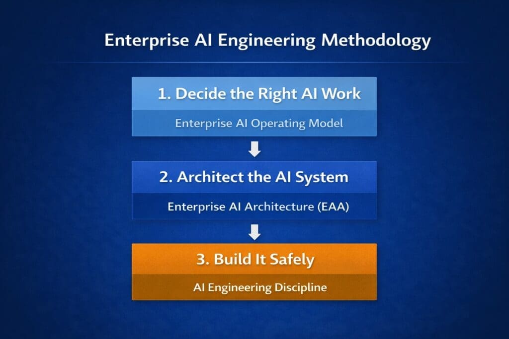 EAEM stands for Enterprise AI Engineering Methodology. It is the umbrella framework for enterprise AI delivery. It simplifies enterprise AI into three major steps: decide the right AI work, architect the AI system, and build it safely. Under that umbrella, it brings together the Enterprise AI Operating Model, Enterprise AI Architecture (EAA), and the engineering discipline needed to move from AI idea to production-ready system.