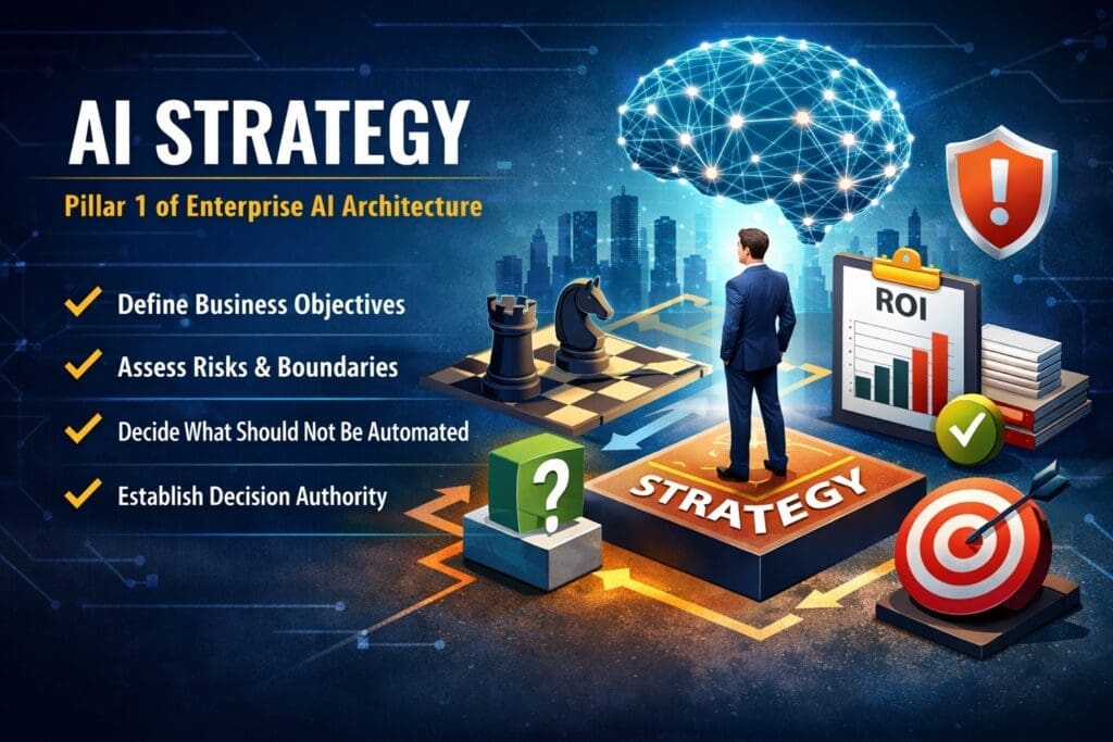 AI Strategy is the first pillar of Enterprise AI Architecture. It defines the business intent, risk tolerance, boundaries, and authority structure for an AI initiative before deeper architecture and engineering begin.