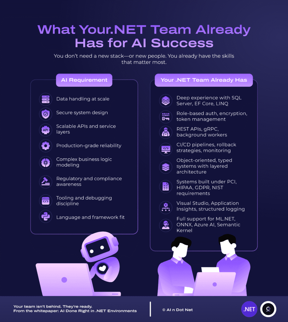 This infographic compares core AI implementation requirements with the existing strengths of .NET teams—showing that your team isn’t behind. They’re ready.